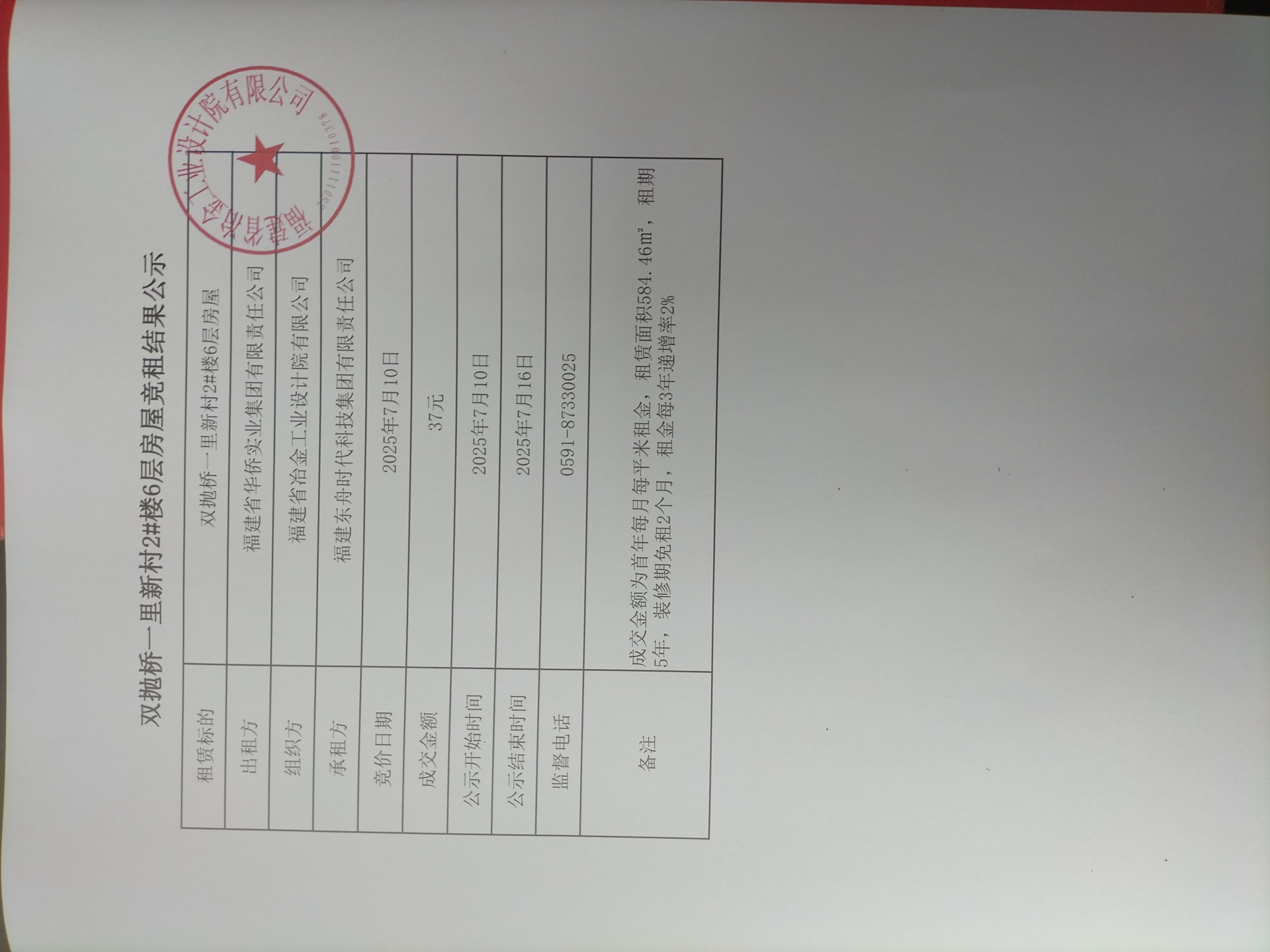 雙拋橋一里新村2#樓6層房屋競租結果公示